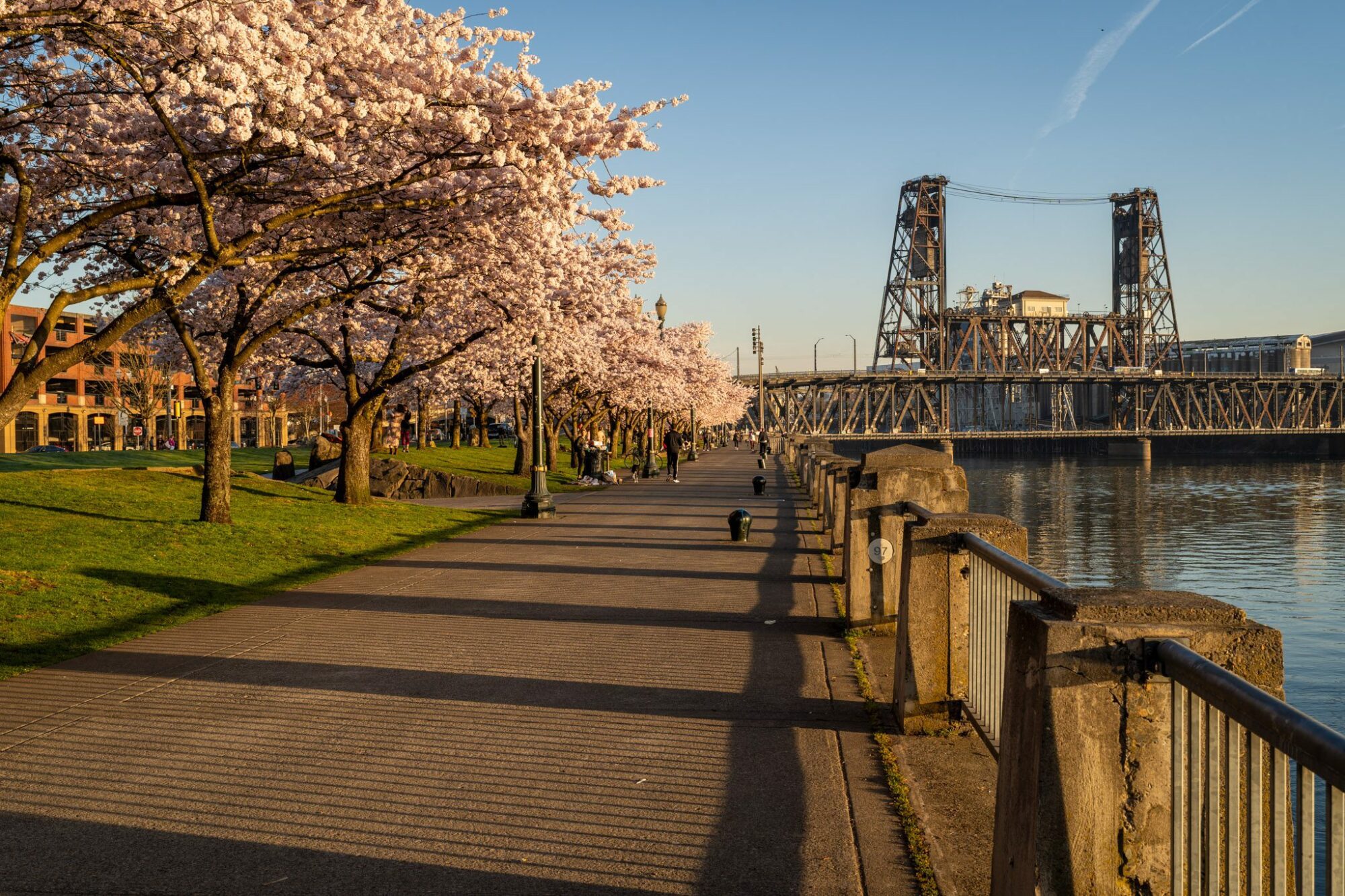 The Portland, Oregon waterfront is shown with blooming cherry trees on one side of a path and a view of the Steel Bridge over the Willamette River Portland’s reputation as a creative city extends into gaming. It has a growing indie developer community, solid internet, and a strong network of gaming cafes and local events. The cost of living isn’t as high as Seattle or San Francisco, which makes it appealing if you want West Coast vibes without breaking the bank.