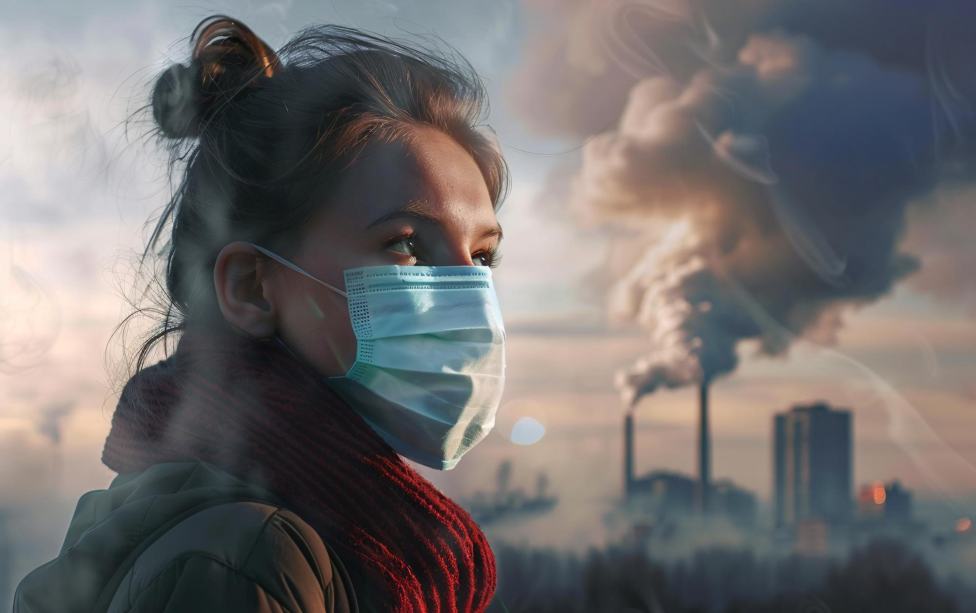 A woman wearing a face mask stands in front of a factory Air quality in Jakarta often becomes unsafe, especially in the dry months from June to September. Visible smog is common, but tiny particles you cannot see do the most harm. Long exposure can cause breathing problems, worsen asthma, irritate eyes, and affect the heart.